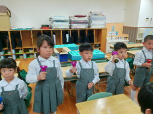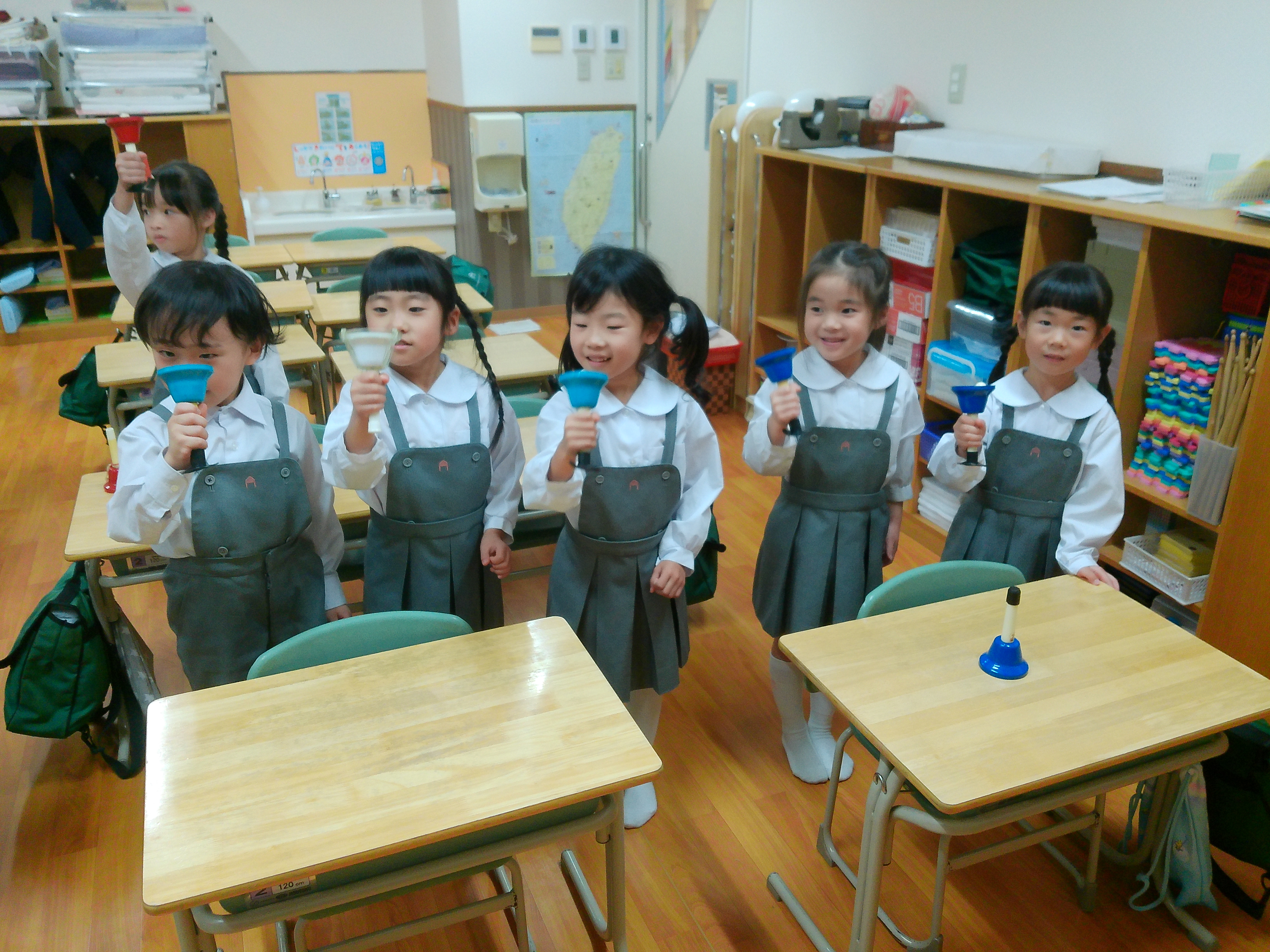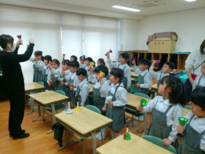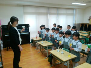 リトミックでハンドベルを行いました。まず、ハンドベルを持つ前に「きよしこの夜」の歌に合わせて、自分の担当している音を手で鳴らしました。それから、小寺先生にハンドベルの持ち方と鳴らし方を教わりました。しっかりと持ち手の部分を握り、ジュースが入っている事を想像しながらこぼれない様に持ち、腕をまっすぐ前に出してから円を描くように音を出す事を知りました。ハンドベルの音色が聞こえると「きれい!」と喜ぶ子ども達。頭の中で「きよしこの夜」のドレミのリズムを思い浮かべながら、それぞれが担当している音の番に合わせて、ハンドベルを鳴らし、演奏を行いました。クリスマス会への期待が高まり、緊張と楽しさが入り混じったような表情で、ハンドベルの演奏を行う姿が見られました。