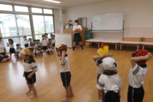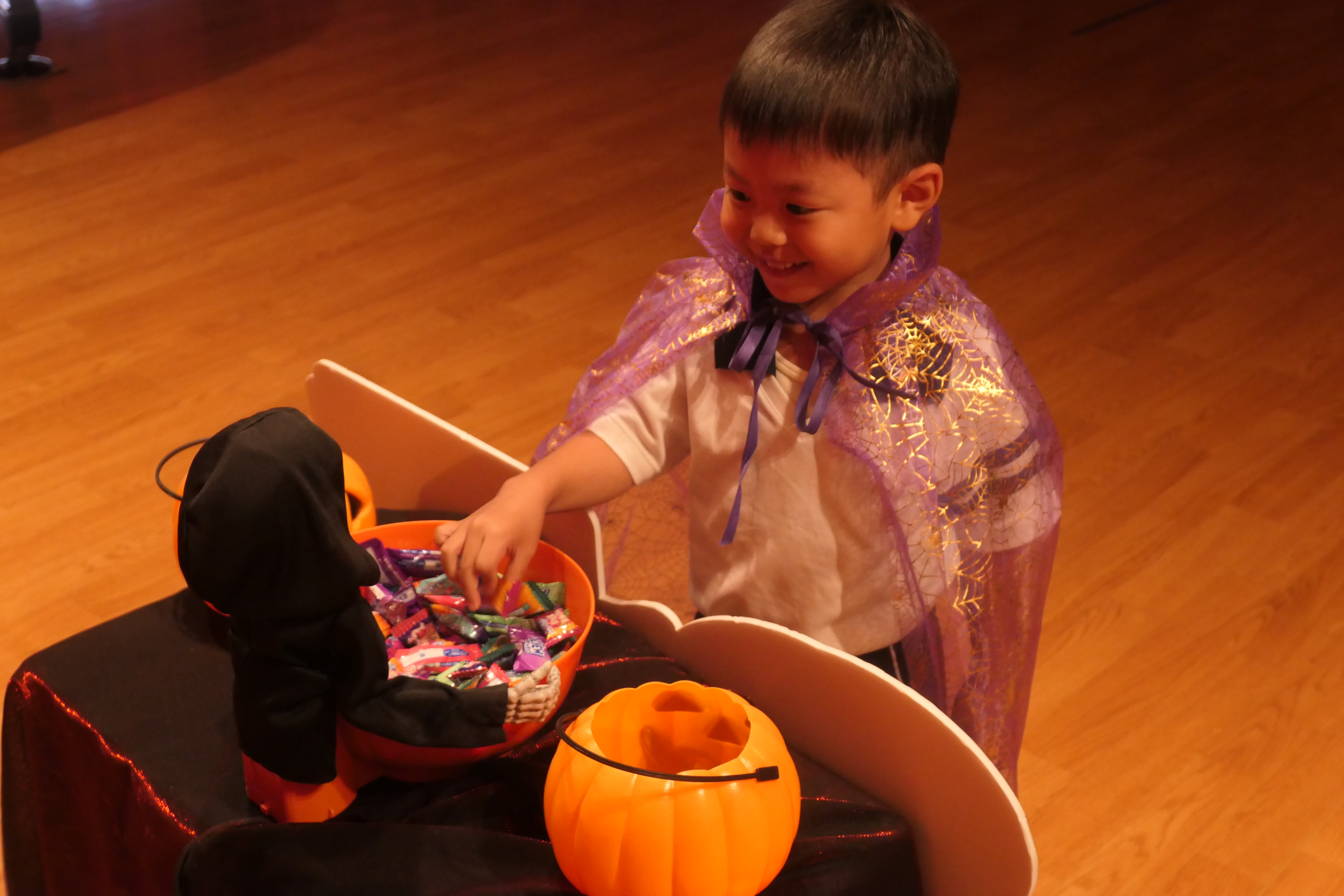 仮装をして他クラスの友達を驚かしに行きました。「ハッピーハロウィン!」と元気に室内に入っていき「お化けだぞ~!!」と遠慮気味に驚かすかわいいぱんだ組の子ども達。 3Fに行くと骸骨の手元にお菓子を発見!!お菓子は欲しいけど怖くて近づくことが難しく「行かない」「怖いよ…」と泣いてしまう姿が見られました。1人のお友達が勇気を振り絞り「トリックオアトリート!!」と元気な声で言うと「僕も行く!!」「私も!!」と次々に行きはじめ、全員お菓子を手にすることが出来ました。「怖かった~」「びっくりしたね」「お菓子取れてよかった~」と友達とホッとした表情を浮かべ喜んでいました。
