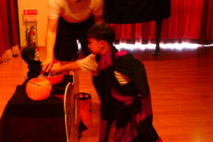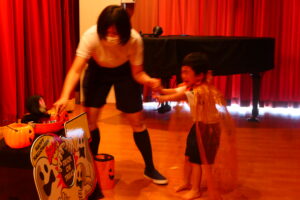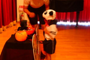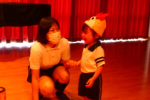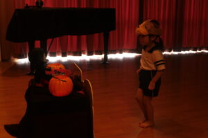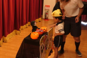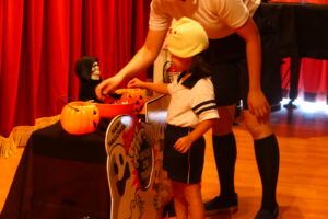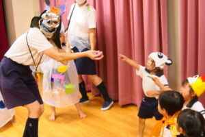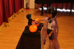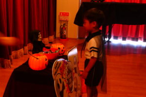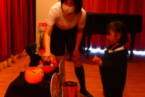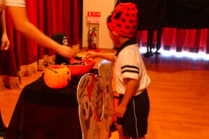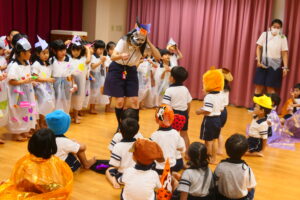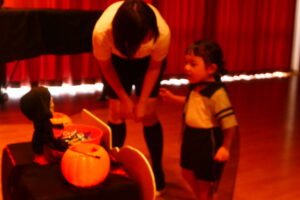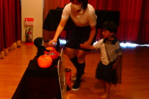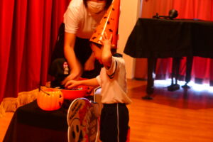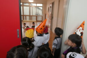仮装をして他クラスの友達を驚かしに行きました。「ハッピーハロウィン!」と元気に室内に入っていき「お化けだぞ~!!」と遠慮気味に驚かすかわいいぱんだ組の子ども達。 3Fに行くと骸骨の手元にお菓子を発見!!お菓子は欲しいけど怖くて近づくことが難しく「行かない」「怖いよ…」と泣いてしまう姿が見られました。1人のお友達が勇気を振り絞り「トリックオアトリート!!」と元気な声で言うと「僕も行く!!」「私も!!」と次々に行きはじめ、全員お菓子を手にすることが出来ました。「怖かった~」「びっくりしたね」「お菓子取れてよかった~」と友達とホッとした表情を浮かべ喜んでいました。